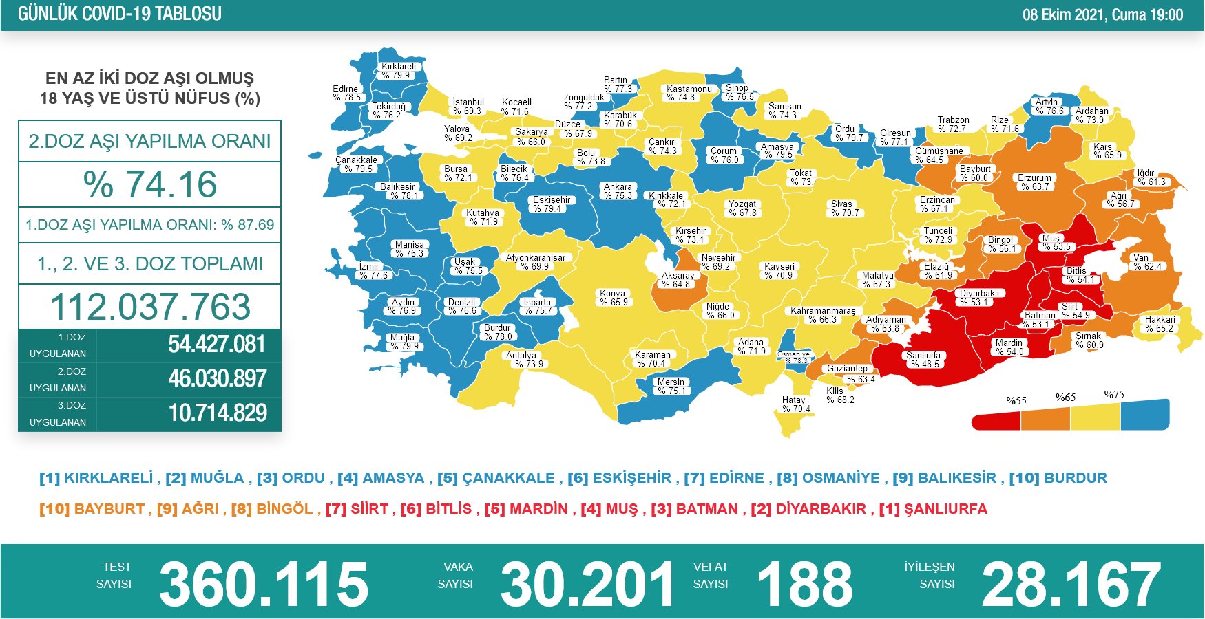 Bakanlığın tablosuna göre yüzde 48,5 ile Türkiye'de en az aşılamanın gerçekleştirildiği Şanlıurfa'yı, Diyarbakır, Batman, Muş, Mardin, Bitlis, Siirt, Bingöl, Ağrı ve Bayburt takip etti. Öte yandan mavi il sayısı Mersin'in eklenmesiyle 26'ya yükseldi.