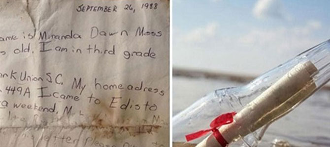 Miranda Chavez isimli genç kadının, 26 Eylül 1988 tarihinde, 8 yaşındayken ABD'nin Edisto Plajı’ndan şişe içinde denize bıraktığı not, 29 yıl sonra yaklaşık 120 kilometre mesafedeki Sapelo Adası’nda ortaya çıktı.