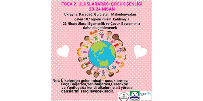 23 Nisan Ulusal Egemenlik ve Çocuk Bayramı kapsamında düzenlenen Foça 2. Uluslararası Çocuk Şenliği 20-24 Nisan 2018 tarihlerinde Foça ve mahallelerinde çeşitli etkinliklerle kutlanacak. Uluslararası kültürleri tanımak, kaynaştırmak ve Dünya barışına katkıda bulunmak amacıyla Foçalı çocuklar, Ukrayna, Karadağ, Gürcistan ve Makedonya'dan gelecek olan misafirleri ağırlayacaklar. Foçalı çocuklar ve gelecek olan misafir çocuklarla birlikte Foça, Bağarası, Yenibağarası, Gerenköy ve Yenifoça'da çeşitli gösteriler yapacaklar.