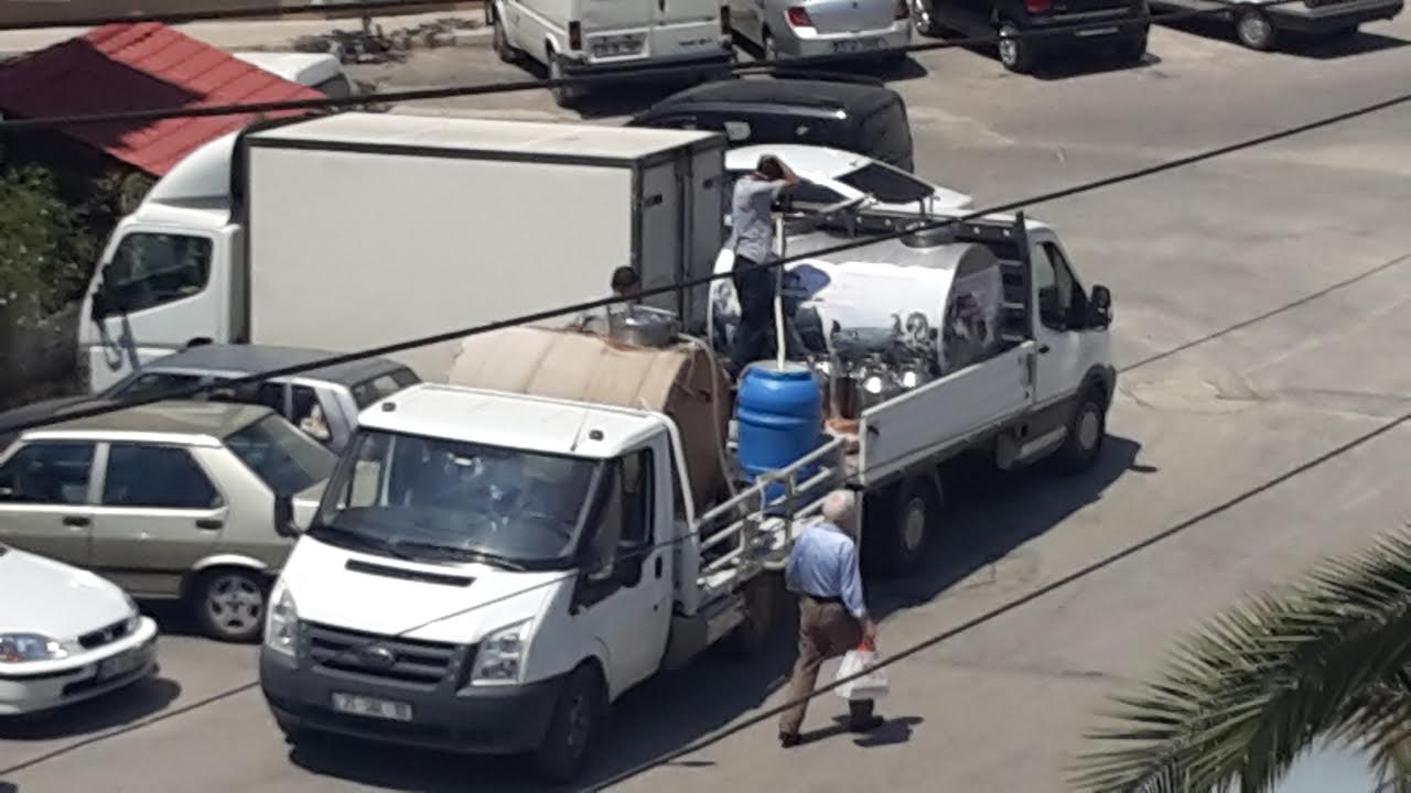 Burası İzmir'in Karabağlar İlçesi'ndeki 9022 sokak. Kamyonetlerin arkasındaki iki süt deposu ve küçük bidonlar içindeki sütlerle mandıralara ve vatandaşlara süt satan iki ayrı kamyonet, birbirine uzun hortumlarla bağlantı kurdular.