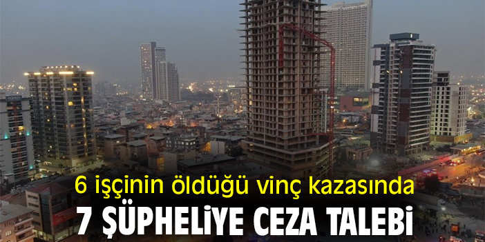 Otel inşaatı sırasında kule vincin devrilmesi sonucu 6 işçinin hayatını kaybettiği kazada 7 şüpheli hakkında ‘Taksirle birden fazla kişinin ölümüne ve yaralanmasına neden olmak’ suçundan 15 yıla kadar hapis cezası talep edildi.