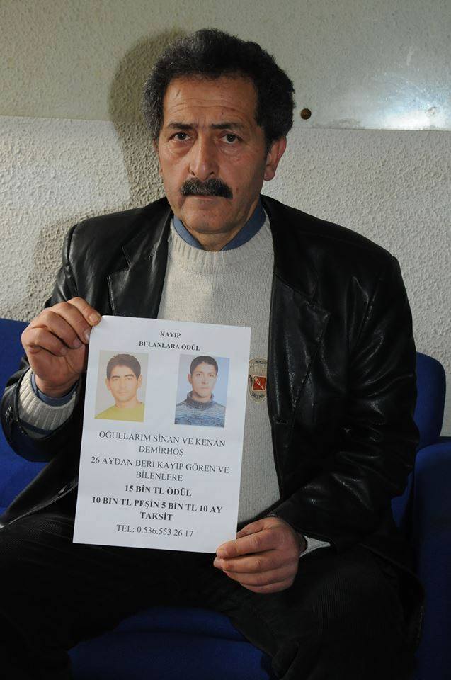 Kenan ve Sinan Demirhoş kardeşlerin babaları Mustafa Demirhoş, "Lütfen çocuklarımın yüzünü gören benimle iletişime geçsin. Bu acımızı dindirmemize vesile olan her kim olurda 50 bin lira ödül vereceğim. İsteyen ismini gizli tutarak bana haber edebilir bana ulaşanların kimlik bilgilerini isterlerse canım pahasına saklayacağım ama yeter ki evlatlarımıza kavuşalım. Çocuklarımızı gören veya bu konuda bilgisi olanların 536 553 26 17 şahsıma ait numaradan ulaşabilirler. Bugüne kadar çok defa dolandırmak isteyenler oldu. Aynı şeyleri yaşamak istemiyoruz. Ailecek zor bir süreçten geçiyoruz. Allah rızası için ne olur gerçek bilgi sahipleri ve gördü tanıkları bize ulaşsın" diye konuştu.