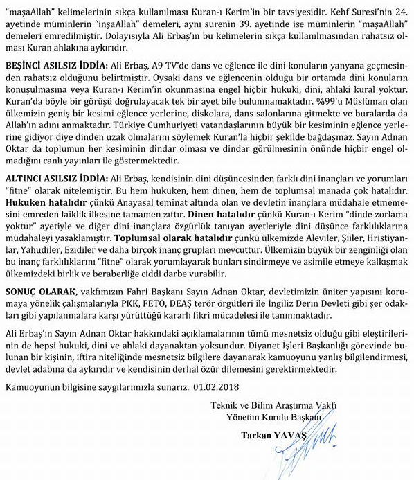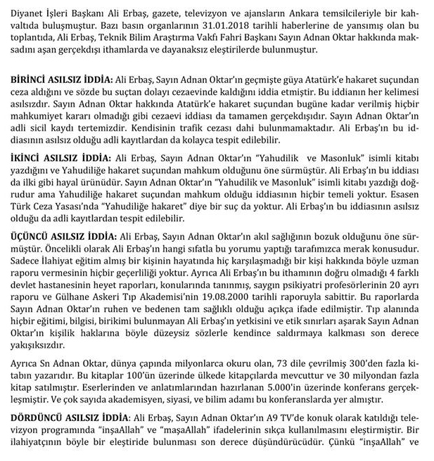 Gazete ve televizyonların Ankara temsilcileriyle Diyanet İşleri Başkanlığında bir araya geldiği toplantıda, gündeme ilişkin değerlendirmede bulunan Diyanet İşleri Başkanı Prof. Dr. Ali Erbaş, Adnan Oktar hakkında çarpıcı açıklamalarda bulundu. Adnan Oktar hakkında, “İnşallahlar, maşallahlar havada uçuşuyor, dini bir takım referanslar ve orada dansöz oynatıyorsun böyle bir şey olabilir mi? Tamamen akli dengesi herhalde bozulmuş” diyen Prof. Dr. Ali Erbaş'a Adnan Oktar'dan ve Teknik ve Bilim Araştırma Vakfı Yönetim Kurulu Başkanı Tarkan Yavaş'tan açıklama geldi.