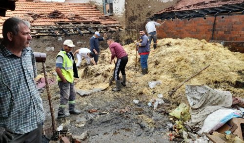 Kütahya'da çıkan ahır yangınında, 1 koyun telef olurken, yaklaşık 200 balya saman yandı.