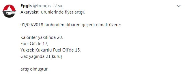 EPGİS tarafından yapılan açıklamada şu ifadelere yer verildi: "Akaryakıt ürünlerinde fiyat artışı. 01/09/2018 tarihinden itibaren geçerli olmak üzere; Kalorifer yakıtında 20, Fuel Oil’de 17, Yüksek Kükürtlü Fuel Oil’de 15, Gaz yağında 21 kuruş"