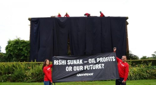 İngiltere hükümetinin 'Kuzey Denizi’nde 100 yeni petrol ve gaz arama ruhsatı' kararının ardından Greenpeace aktivistleri İngiltere Başbakanı Rishi Sunak’ın North Yorkshire’daki 1826 yılında inşa edilmiş Grade II kategorisinde koruma altında olan evinin çatısına çıktı. Çatıya çıkan aktivistler evi siyah bir örtüyle kapladıktan sonra “Rishi Sunak-petrol kârı mı bizim geleceğimiz mi?” yazılı pankart açtı. Aktivistlerden Philip Evans, “Kuzey Denizi’nde yeni bir sondaj çılgınlığının ciddi sonuçlarını Başbakan’ın evine taşımak için buradayız” dedi. North Yorkshire Polisi, kısa süre içerisinde memurların olay yerine gelerek duruma müdahale ettiklerini açıkladı.