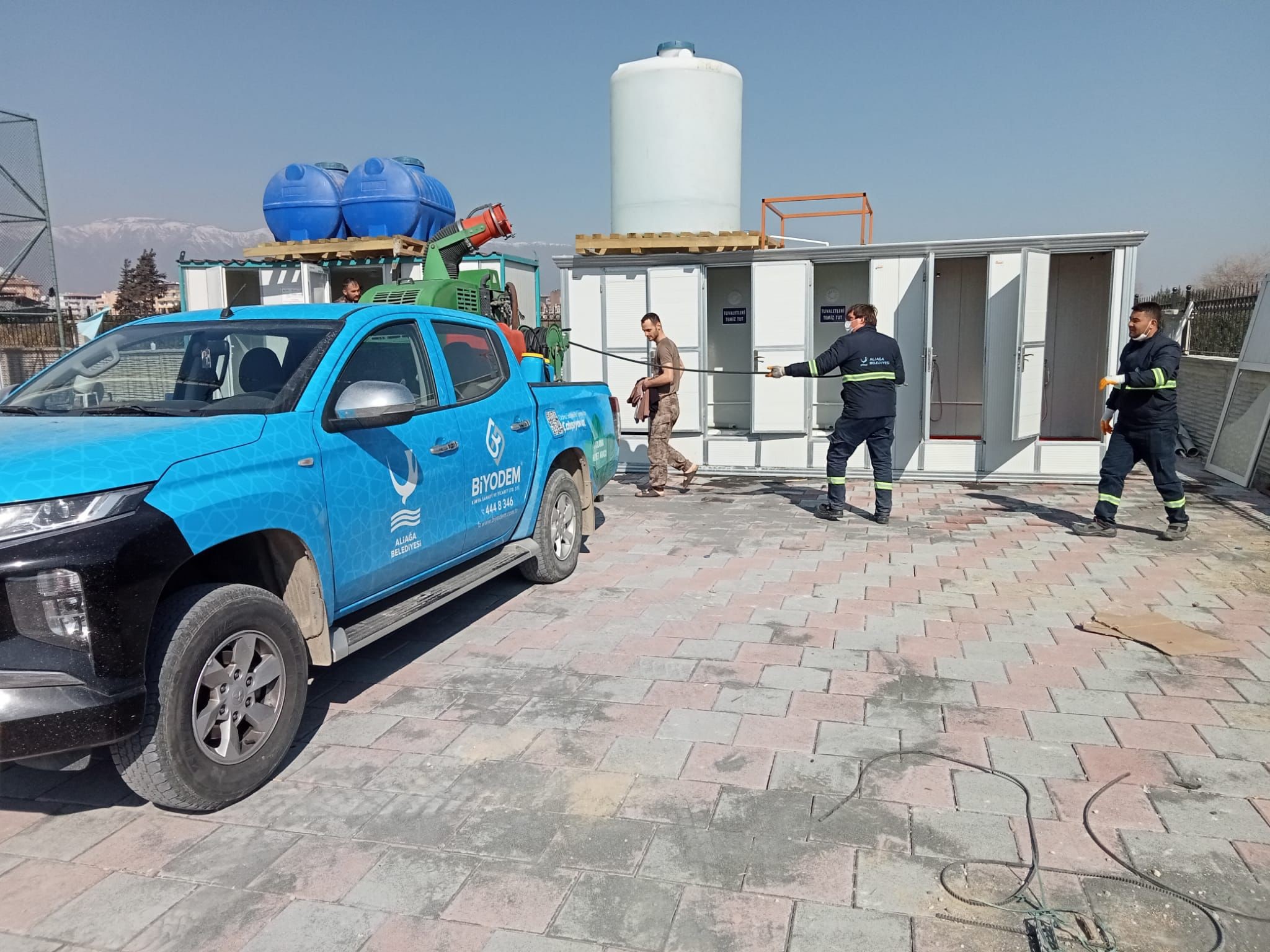 Sağlık Bakanı Fahrettin Koca başkanlığında yapılan toplantıda Hatay'da dezenfeksiyon ve ilaçlama konusunda Gölcük Belediyesine tam yetki verilmiş ve çalışmalar başlamıştı. Aliağa Belediyesi ekipleri de AFAD tarafından Gölcük Belediyesi koordinesinde olan bölgede çalışmalara katılıyor. Ekipler, çadır kentlerde vatandaşların sağlığını korumak için bulaşıcı hastalıkların taşınmasına neden olan haşereler ve kemirgenlere karşı dezenfeksiyon işlemlerini kesintisiz sürdürüyor.