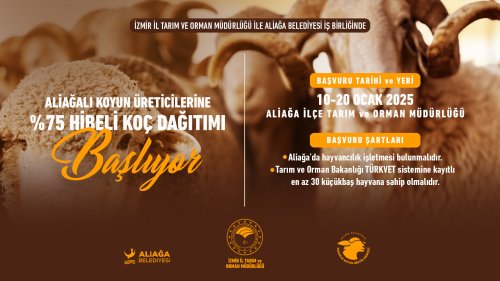 İzmir Tarım ve Orman İl Müdürlüğü ile Aliağa Belediyesi iş birliğinde Aliağalı Koyun Üreticilerine yüzde 75 hibeli koç dağıtımı yapılacak. Üreticiler, 10-20 Ocak tarihleri arasında Aliağa İlçe Tarım ve Orman Müdürlüğü’ne müracaat edebilecek.