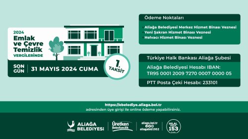 Borç yükümlülüğü olan vatandaşlar, 2024 Yılı Emlak ve Çevre Temizlik Vergisi 1. taksit ödemelerini 31 Mayıs Cuma günü saat 17.00’ye kadar Aliağa Belediyesi Merkez Hizmet Binası, Yeni Şakran Hizmet Binası ve Helvacı Hizmet Binası’ndaki veznelerden yapabiliyor.