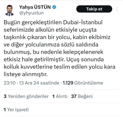 THY Basın Müşaviri Yahya Üstün, yolcunun kara listeye alındığını sosyal medya hesabından duyurdu.