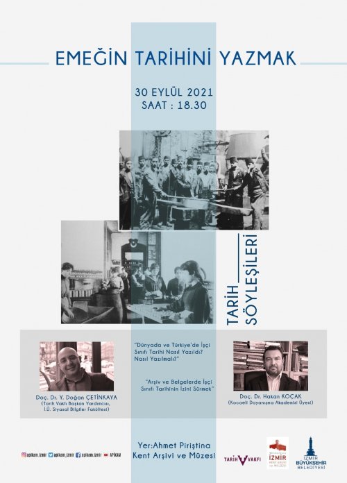 İzmir Büyükşehir Belediyesi Ahmet Piriştina Kent Arşivi ve Müzesi tarafından Tarih Vakfı işbirliğiyle düzenlenen “Tarih Söyleşileri” dizisi, 30 Eylül 2021 perşembe 18.30'da "Emeğin Tarihini Yazmak" konusuyla devam edecek. İstanbul Üniversitesi Siyasal Bilgiler Fakültesi Öğretim Üyesi ve Tarih Vakfı Başkan Yardımcısı Doç. Dr. Y. Doğan Çetinkaya "Dünyada ve Türkiye'de İşçi Sınıfı Tarihi Nasıl Yazıldı, Nasıl Yazılmalı?", Kocaeli Dayanışma Akademisi'nden Doç. Dr. Hakan Koçak ise "Arşiv ve Belgelerde İşçi Sınıfı Tarihinin İzini Sürmek" başlıklı sunumlarını yapacak.