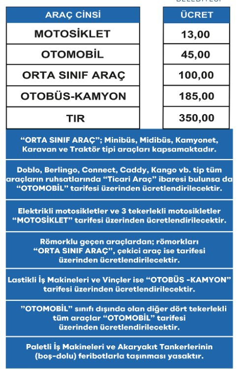 İzmir Büyükşehir Belediyesi, Bostanlı ve Üçkuyular arasında çalışan arabalı vapur ücretlerine zam yaptı. Yeni gelen zamlara göre; otomobil ücretlendirmesi 35 TL’den 45 TL’ye, minibüs ve kamyonetleri dahil eden orta sınıf araçlar 70 TL’den 100 TL’ye, otobüs ve kamyonlar 140 TL’den 185 TL’ye, TIR geçiş ücretleri 270 TL’den 350 TL’ye, tüm motosikletleri dahil eden geçiş ücreti 9 TL’den 13 TL’ye yükseltildi.
