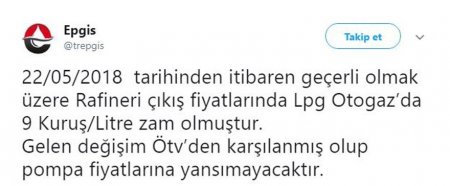 EPGİS yaptığı paylaşımda, “22/05/2018 tarihinden itibaren geçerli olmak üzere Rafineri çıkış fiyatlarında Lpg Otogaz'da 9 Kuruş/Litre zam olmuştur. Gelen değişim ÖTV'den karşılanmış olup pompa fiyatlarına yansımayacaktır.