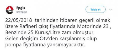 “22/05/2018 tarihinden itibaren geçerli olmak üzere Rafineri çıkış fiyatlarında Motorinde 23, Benzinde 25 Kuruş/Litre zam olmuştur. Gelen değişim ÖTV'den karşılanmış olup pompa fiyatlarına yansımayacaktır” ifadeleri kullanıldı.