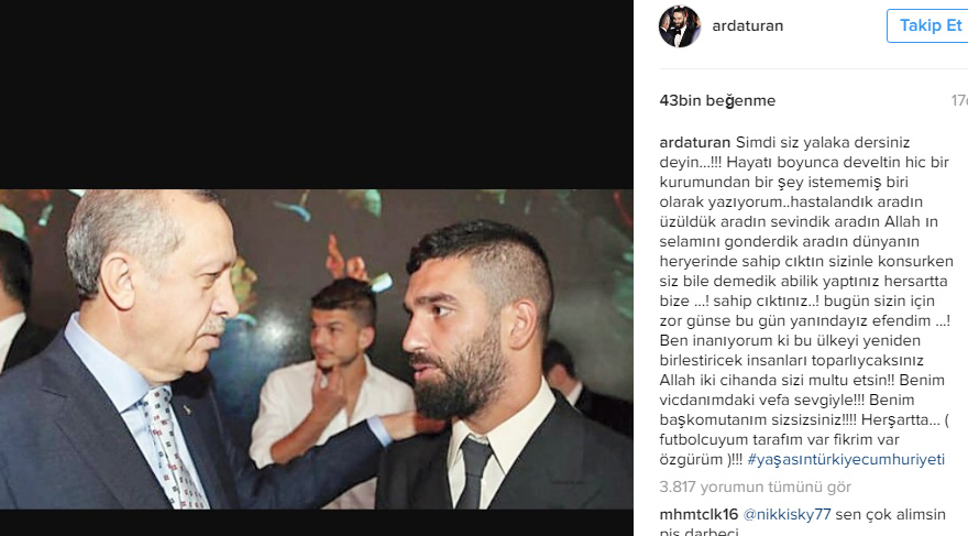 Simdi siz yalaka dersiniz deyin…!!! Hayatı boyunca develtin hiç bir kurumundan bir şey istememiş biri olarak yazıyorum.. Hastalandık aradın üzüldük aradın sevindik aradın Allah’ın selamını gönderdik, aradın dünyanın her yerinde sahip çıktın. Sizinle konuşurken siz bile demedik abilik yaptınız her şartta bize …! Sahip çıktınız..! Bugün sizin için zor günse bu gün yanındayız efendim …! Ben inanıyorum ki bu ülkeyi yeniden birleştiricek, insanları toparlıycaksınız Allah iki cihanda sizi multu etsin!! Benim vicdanımdaki vefa sevgiyle!!! Benim başkomutanım sizsizsiniz!!!! Her şartta… ( futbolcuyum tarafım var fikrim var özgürüm )!!!
