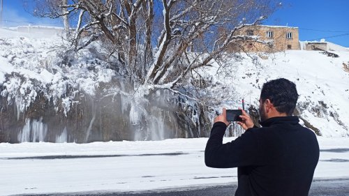 Bitlis'te bulunan ve soğuk hava nedeniyle donan Arpet Şelalesi kartpostallık görüntüler oluşturdu.