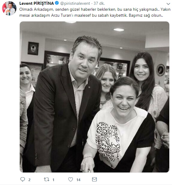 Bir süredir kanser tedavisi gören Buca Belediyesi Buca Belediyesi Basın Yayın ve Halkla İlişkiler Müdürü meslektaşımız Arzu Turan hayatını kaybetti. Bu sabah saatlerinde hayata gözlerini yuman Arzu Turan'ın vefatını Buca Belediye Başkanı Levent Piriştina sosyal medya hesaplarında duyurdu.