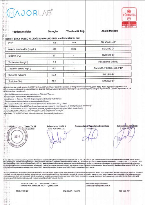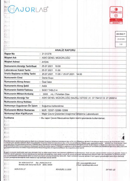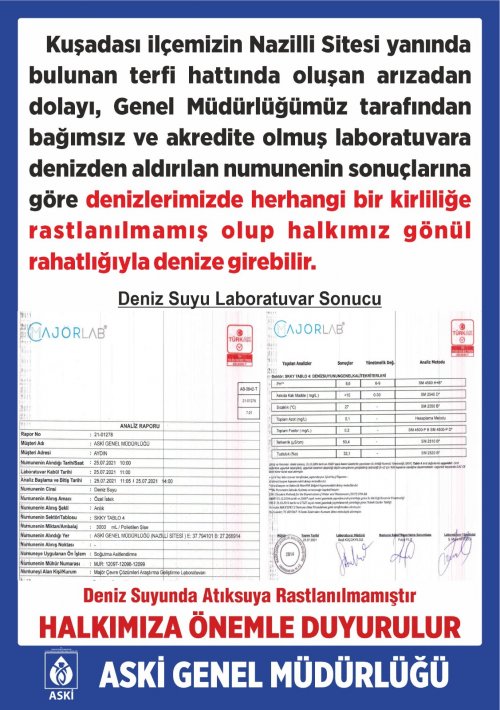 ASKİ Genel Müdürlüğü tarafından bağımsız ve akredite olmuş bir laboratuvara yaptırılan deniz suyu analiz testi tüm gerçekleri ortaya çıkarttı. Analiz sonuçlarında, numunenin deniz suyu kriterlerine uygun ve herhangi bir atık su içermediği resmi olarak belgelendi. Kuşadası Belediye Başkan vekili Hayati Atlı vatandaşların gönül rahatlığı ile plajı kullanabileceklerini belirtti. Başkan Vekili Hayati Atlı yaptığı açıklamada ; “Meydana gelen arıza sonrası, bazı kalemşor yerel ve ulusal basın yayın organları, siyasi parti temsilcisi görev ve sorumluluk bilgisi dışındaki il bürokratları Aydın Büyükşehir ve Kuşadası Belediyesi hizmetlerini tek merkezden talimat almışçasına karalamayı hedef alan açıklamalar yapmışlardı. Yapılan laboratuvar test sonuçlarının da ortaya koyduğu üzere karalama kampanyasının yine kamuoyu nezdinde başarıya ulaşmadığı ve asla ulaşmayacağı bir kez daha ortaya çıkmıştır. ASKİ Genel Müdürlüğünce yapılan açıklamada da olduğu gibi plajlarımız gönül rahatlığı ile kullanılabilir” diye konuştu.