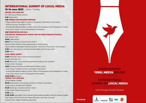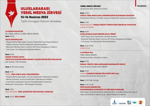 EFJ genel kuruluna paralel olarak yine Havagazı Fabrikası’nda İzmir Büyükşehir Belediyesi’nin ev sahipliğinde Uluslararası Yerel Medya Zirvesi düzenlenecek. Türkiye Gazeteciler Sendikası (TGS) ve İzmir Gazeteciler Cemiyeti (İGC) tarafından hayata geçirilen zirveye, Türkiye’den 50 basın meslek örgütü temsilcisi katılacak. Zirve yerel medyanın güçlenmesine aracılık etmeyi amaçlıyor.