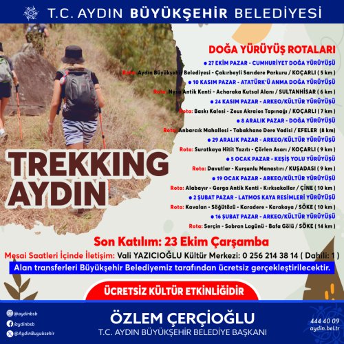 Aydın Büyükşehir Belediyesi, her yıl olduğu gibi bu yıl da doğa ve sporseverleri "Trekking Aydın" etkinliği ile buluşturmaya hazırlanıyor.
