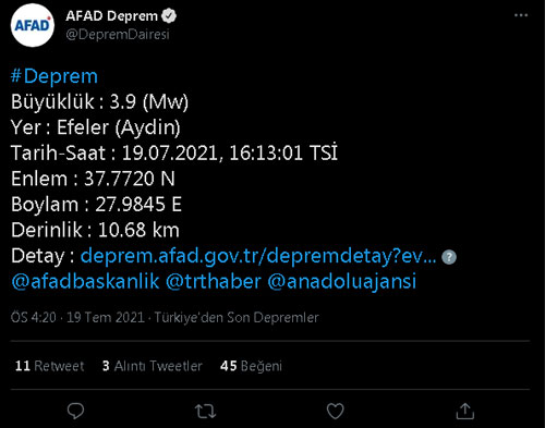 Aydın’ın Efeler ilçesinde 3.9 büyüklüğünde deprem meydana geldi. Afet ve Acil Durum Yönetimi Başkanlığı’ndan (AFAD) alınan bilgiye göre, yerin 10.68 kilometre derinliğinde saat 16.13’de 3,9 büyüklüğünde bir deprem meydana geldi. Deprem Efeler ilçesi ve Aydın’ın doğu ilçelerinde hissedilirken, herhangi bir can ve mal kaybı yaşanmadığı öğrenildi.