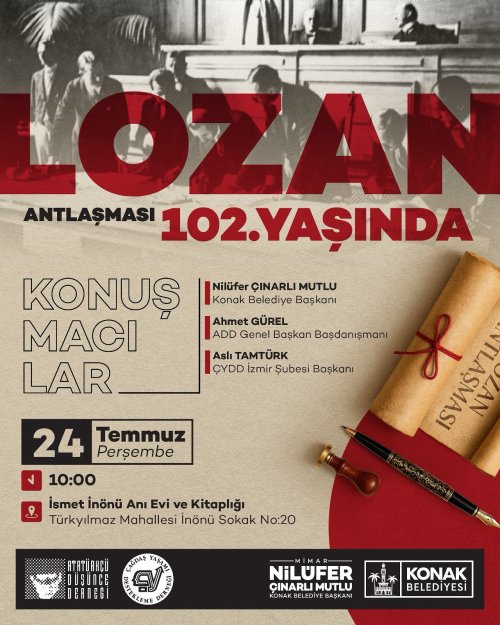 MEDYA EGE - Konak Belediyesi, Atatürkçü Düşünce Derneği (ADD) ve Çağdaş Yaşamı Destekleme Derneği (ÇYDD) iş birliğiyle, Lozan Barış Antlaşması’nın 102. yıl dönümü için anlamlı bir etkinlik düzenliyor. Etkinlik, 24 Temmuz Perşembe günü saat 10.00’da Türkyılmaz Mahallesi’ndeki İsmet İnönü Anı Evi ve Kitaplığı’nda gerçekleştirilecek.