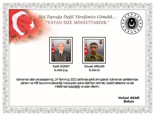 Milli Savunma Bakanı Hulusi Akar, Fırat Kalkanı Harekatı bölgesinde yapılan saldırıda şehit olan İstihkam Astsubay Çavuş Fatih Güney ve İstihkam Sözleşmeli Er Emrah Arslan için başsağlığı diledi