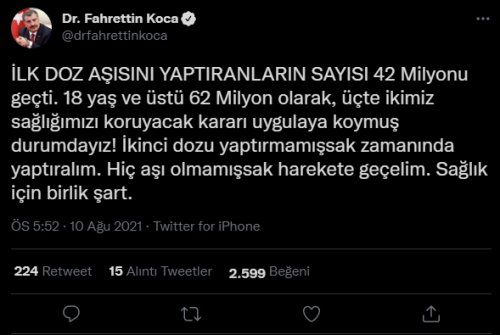 Bakan Koca sosyal medya hesabından: "İlk doz aşısını yaptıranların sayısı 42 milyonu geçti. 18 yaş ve üstü 62 milyon olarak, üçte ikimiz sağlığımızı koruyacak kararı uygulamaya koymuş durumdayız. İkinci dozu yaptırmamışsak zamanında yaptıralım. Hiç aşı olmamışsak harekete geçelim. Sağlık için birlik şart" dedi.