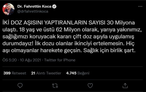 Bakan Koca yaptığı paylaşımda : "İki doz aşısını yaptıranların sayısı 30 milyona ulaştı. 18 yaş ve üstü 62 milyon olarak, yarıya yakınımız, sağlığımızı koruyacak kararı çift doz aşıyla uygulamış durumdayız. İlk dozu olanlar ikinciyi ertelemesin. Hiç aşı olmayanlar harekete geçsin. Sağlık için birlik şart" açıklamasında bulundu.