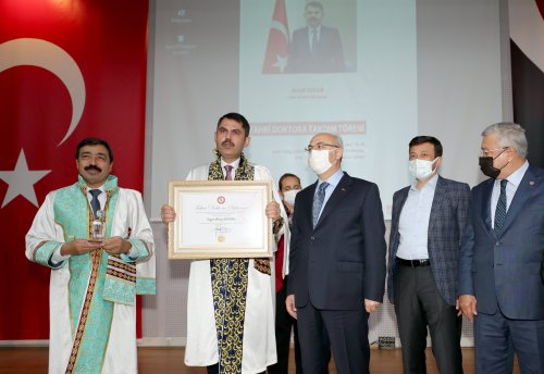 Konuşmaların ardından Çevre ve Şehircilik Bakanı Murat Kurum’a fahri doktora unvanı takdim edildi.