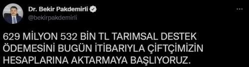 Tarım ve Orman Bakanı Dr. Bekir Pakdemirli, 5 farklı kalemde 629 milyon 532 bin liralık tarımsal destek ödemesinin bugün itibarıyla çiftçilerin hesaplarına aktarmaya başladıklarını açıkladı.