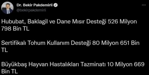 Bakan Pakdemirli, sosyal medya hesabından yaptığı paylaşımda, Hububat, Baklagil ve Dane Mısır Desteği kapsamında 526 milyon 798 bin lira, Sertifikalı Tohum Kullanım Desteği kapsamında 80 milyon 651 bin lira, Büyükbaş Hayvan Hastalıkları Tazminatı kapsamında 10 milyon 669 bin lira, Kırsal Kalkınma Yatırımlarının Desteklenmesi kapsamında 8 milyon 38 bin lira ve Çiftlik Muhasebe Veri Ağı Katılım Primi kapsamında 3 milyon 373 bin lira olmak üzere toplamda 629 milyon 532 bin liralık tarımsal destek ödemesinin bugün itibarıyla çiftçilerin hesaplarına aktarılmaya başladıklarını açıkladı.