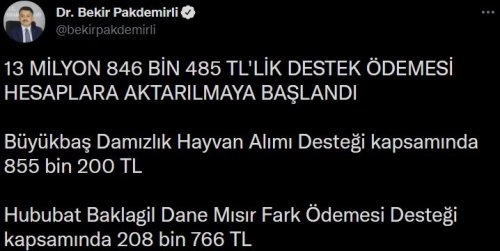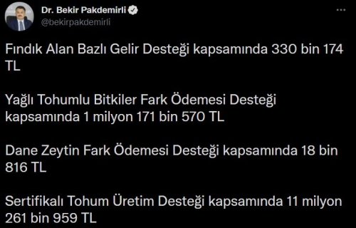 Tarım ve Orman Bakanı Bekir Pakdemirli, kişisel sosyal medya hesabından yaptığı açıklamada, Büyükbaş Damızlık Hayvan Alımı Desteği kapsamında 855 bin 200 lira, Hububat Baklagil Dane Mısır Fark Ödemesi Desteği kapsamında 208 bin 766 lira, Fındık Alan Bazlı Gelir Desteği kapsamında 330 bin 174 lira, Yağlı Tohumlu Bitkiler Fark Ödemesi Desteği kapsamında 1 milyon 171 bin 570 lira, Dane Zeytin Fark Ödemesi Desteği kapsamında 18 bin 816 ve Sertifikalı Tohum Üretim Desteği kapsamında 11 milyon 261 bin 959 lira ile toplamda 13 milyon 846 bin 495 bin liralık destek ödemesinin hesaplara aktarılmaya başlandığını ifade etti.