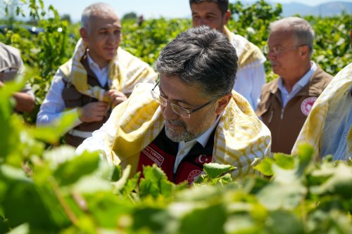 Tarım ve Orman Bakanı İbrahim Yumaklı Manisa'nın Saruhanlı ilçesinde üzüm hasadına katıldı. İlk olarak çiftçilerle sohbet eden Bakan Yumaklı eline bağ makası alarak üzüm hasat etti. Hasat töreni ardından konuşan Bakan Yumaklı, rekoltenin geçtiğimiz yıla göre yüksek olduğunu belirterek, “Bugün Manisa'da Manisa'nın alameti farikası Sultani çekirdeksiz üzümünün organik olarak üretilen bir bağında sembolik olarak da olsa bir açılışı yapmış olduk. Ama aslında mevsimlerin öne gelmesiyle beraber bizim 15 gün sonra başlamasını beklediğimiz hasatta herhalde bugünlerde başlamış olacak inşallah. Manisa üzümde birinci malumunuz ama ondan çok daha önemli özellikle bu Sultaniye üzümünün ihracat potansiyeli. Hakikaten çok ciddi bir şekilde talep gören bir ürün. Geçtiğimiz yıl 500 milyon dolar civarında bir ihracat rakamı oldu. Rekolteyle alakalı, bu yılın geçtiğimiz yıldan çok farklı olmayacağını değerlendiriyoruz açıkçası. Biraz daha iyi ama iklim şartları beklediğimizin üzerinde bir rekolte gelmesine engel olmuş oldu. Ama geçtiğimiz yıldan kesinlikle kötü değil. Ben şimdiden burada üretim yapan bütün üreticilerimize hayırlı, uğurlu, bereketli olmasını diliyorum. Hem buradaki üreticilerimize hem Manisa'daki bütün üreticilerimize Türkiye'deki bütün üreticilerimize geçmiş ve bundan sonra olacak hasat dönemindeki ürünler için bolluk, bereket ve bol kazanç diliyorum” ifadelerini kullandı.