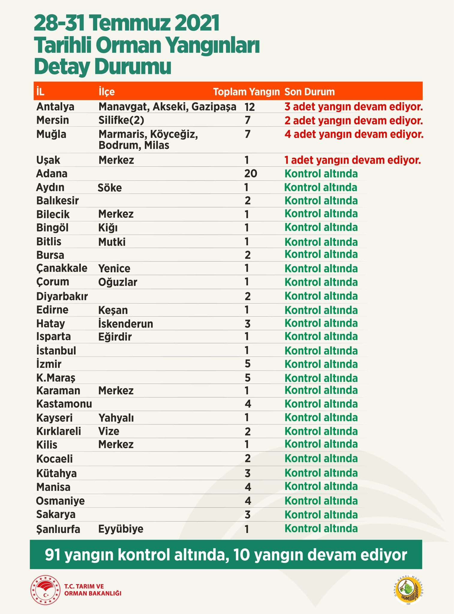 Tarım ve Orman Bakanı Pakdemirli, paylaştığı 28-31 Temmuz 2021 tarihli orman yangınları detay durumu listesine göre; çıkan yangınlardan 92 orman yangının kontrol altına alındığını, 9 yangını ise kontrol altına alma çalışmaları devam ediyor.