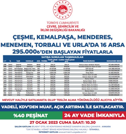 Çevre, Şehircilik ve İklim Değişikliği Bakanlığı, Çeşme, Kemalpaşa, Menderes, Menemen, Torbalı ve Urla ilçelerinde bazı parselleri satışa çıkardı.