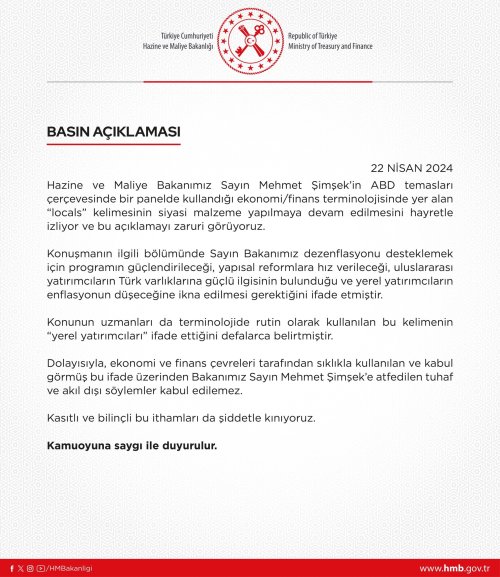 “Hazine ve Maliye Bakanımız Sayın Mehmet Şimşek'in ABD temasları çerçevesinde bir panelde kullandığı ekonomi/finans terminolojisinde yer alan ‘locals’ kelimesinin siyasi malzeme yapılmaya devam edilmesini hayretle izliyor ve bu açıklamayı zaruri görüyoruz.