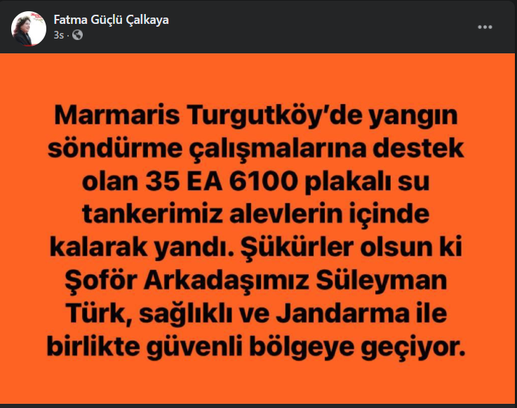 Balçova Belediyesi Başkanı Fatma Güçlü Çalkaya, Marmaris'e yangın söndürme desteği için gönderdikleri su aracının yandığını duyurdu.
