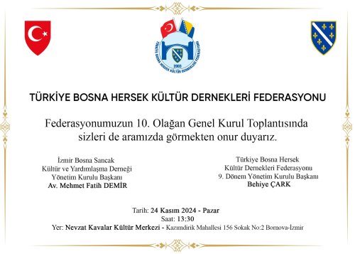Türkiye Bosna Hersek Kültür Dernekleri Federasyonu'nun 10. Olağan Genel Kurulu'nda, federasyonumuzun geleceği adına önemli bir adım atıyoruz. Bu süreçte, Bosna Hersek kültürünü yaşatma ve tanıtma misyonumuzu daha da ileriye taşıyacağımıza inanıyorum.