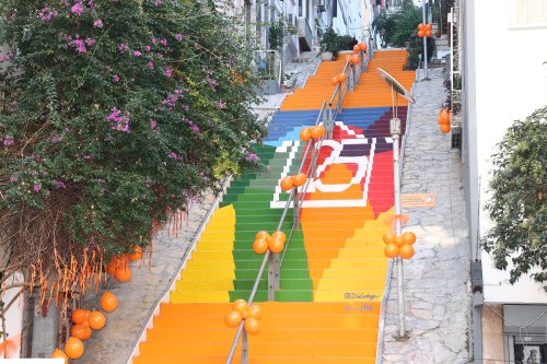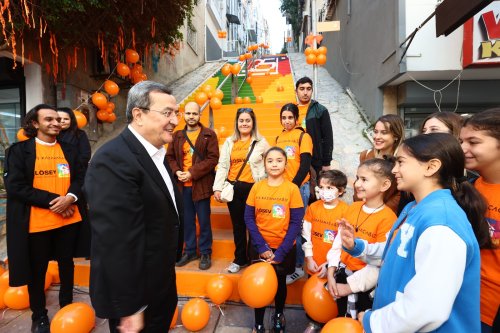 MEDYA EGE - Lösemili Çocuklar Sağlık ve Eğitim Vakfı (LÖSEV) tarafından, Lösemili Çocuklar Haftası kapsamında, Konak Karataş'ta Şehit Kemal Keser Sokağı'nın merdivenleri, löseminin rengi turuncuya boyandı.