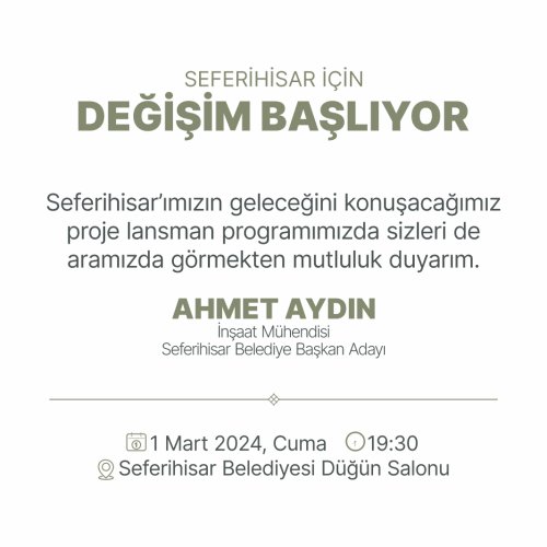 Cumhur İttifakı Seferihisar Belediye Başkan Adayı Ahmet Aydın, 1 Mart Cuma günü saat 19.30'da Seferihisar Belediye Düğün Salonu'nda "Seferihisar için Değişim Başlıyor Proje Lansman Toplantısı" düzenleyecek.