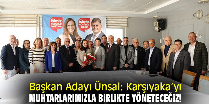 Cumhuriyet Halk Partisi (CHP) Karşıyaka Belediye Başkan Adayı Yıldız İşçimenler Ünsal, Karşıyaka’nın mahalle muhtarları ile bir araya geldi. CHP İzmir Büyükşehir Belediye Başkan Adayı Dr. Cemil Tugay’ın da katıldığı buluşmada muhtarların en yakın ekip arkadaşları olacağını vurgulayan Ünsal, “5 yıl boyunca muhtarlarımızla birlikte kentimize hizmet üretmekten mutluluk duyacağım” dedi.