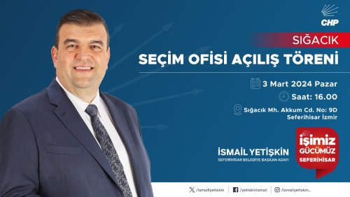 Başkan Adayı Yetişkin, ayrıca sosyal medya hesabından Sığacık Seçim Ofisi’nin 3 Mart Pazar günü açılacağını duyurarak, vatandaşları davet etti. Yetişkin, paylaşımında “Hizmetlerimizle güzelleştirdiğimiz Seferihisar’ı hep birlikte yarınlara taşıyacağız. Sığacık Seçim Ofisi açılışımıza davetlisiniz” dedi.