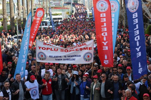 Belediye-İş Sendikası ile İzmir Büyükşehir Belediyesi arasında devam eden ve İzmir Büyükşehir Belediyesi, İZSU, İZDOĞA, İZBETON ve İZULAŞ’da çalışan emekçileri kapsayan toplu iş sözleşmesinin (TİS) yapılan görüşmeler sonrasında tıkanması sonucunda yaklaşık 6 bin işçi eyleme çıktı. Saat 10.00’da Konak Pier Binası önünde toplanan binlerce işçi, İzmir Büyükşehir Belediyesi Egemenlik Evi Binası önüne sloganlar atarak yürüdü.