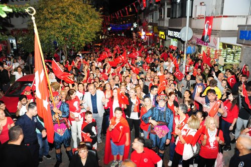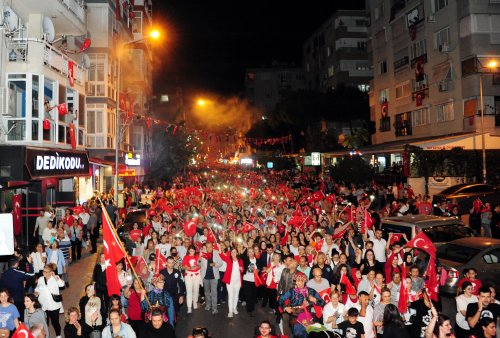 Ata ve Sakarya Caddeleri boyunca 190 metre uzunluktaki Türk Bayrağı ve Atatürk posterini taşıyan vatandaşlar, bir yandan da marşlar söyledi. Korteji balkonlarından izleyen vatandaşlarda korteji alkış, meşale ve çiçeklerle selamladı.