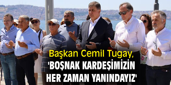 Tarihte yaşanmış böyle acı olayların hatırlanması ve bu olaylardan ders alınması gerektiğini belirten Karşıyaka Belediye Başkanı Dr. Cemil Tugay konuşmasında şunları kaydetti: “İnsanın belki de ilk sıradaki hakkı yaşam hakkıdır. Bu anıtın önünde bugün Bosna Hersek’te kaybettiğimiz soydaşlarımızı anma nedenimiz, onların yaşam hakkının elinden alınmasıdır. Bunun çok zalimce, adaletsizce yapılmış olmasıdır. Tarihin yazması gereken en ağır soykırımlardan biridir. 11 Temmuz 1995’te başlayan, bir hafta kadar sürdüğü söylenen süreçte tamamen masum hiçbir silahı olmayan, savaşmayan insanları; kadın, çoluk, çocuk demeden vahşice katledip toplu mezarlara gömülmüştür. O gün yapılan soykırıma ne yazık ki, uluslararası toplumun da göz yumduğu aslında hepimizin hiçbir zaman unutmaması gereken, hatırlaması gereken bir gerçek. 8 bin 370 insan birkaç gün içerisinde orada katledildi ve her biri ayrı ayrı toplu mezarlara gömüldü. O mezarlığın tamamı halen bulunmuş değil. Bu sene kimlikleri tespit edilen 50 tane Boşnak, bugün defnedilecek. Ne acı ki halen binlerce Boşnak’ın kimlikleri tespit edilmeye çalışılıyor. Karşıyaka’mızın çok değerli belediye başkanı Ahmet Kemal Baysak’ın o günlerde orada yaşanan zulme karşı gösterdiği direnç, Boşnakların yanında yer almak için elinden geleni yapması bir kahramanlıktır. Onunla gurur duyuyoruz, mekanı cennet olsun diyoruz. Bir daha benzer olayların olmaması elbette ki en büyük dileğimiz; ‘Yurtta barış, dünyada barış.’ Biz barışa inanan insanlarız ama bize yönelen her türlü saldırıya karşı da her zaman güçlü ve dirençli olmamız hem Türkiye’de hem de Türkiye dışında yaşayan tüm soydaşlarımıza, kardeşlerimize gerektiği zaman sahip çıkacak güce, sahip olmamızın ne kadar gerekli olduğunu bu olayla bir kez daha hatırlamalıyız. 27 yıl değil, 127 yıl, 527 yıl geçse de buna benzer haksızlıkları her zaman hatırlamalı, bunlardan ders çıkarılmalı ve geleceğe öyle hazırlanmalıyız.”