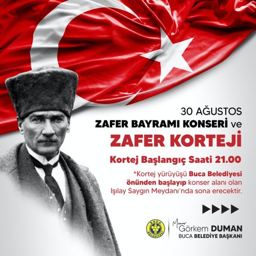 Türk milletinin bağımsızlık ve özgürlük mücadelesinin simgesi olan 30 Ağustos Zafer Bayramı, Buca’da coşkuyla kutlanacak. Kutlamaların en önemli ayağı 30 Ağustos Cuma günü saat 21.00’de Buca Belediyesi önünden düzenlenecek kortej yürüyüşü olacak. Türk bayrakları ve meşaleler eşliğinde gerçekleştirilecek yürüyüş, Işılay Saygın Meydanı’nda son bulacak.