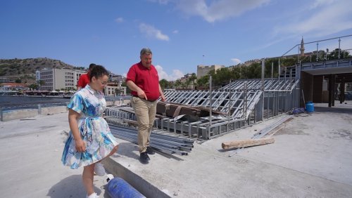 Cumhuriyet Meydanı'nda yapımı devam eden güneşlenme terasında gerçekleştirilen çalışmaları yerinde inceleyen Çeşme Belediye Başkanı Ekrem Oran, "Meydanımızı denizle buluşturacak olan projemiz çok yakında tamamlanacak" dedi.