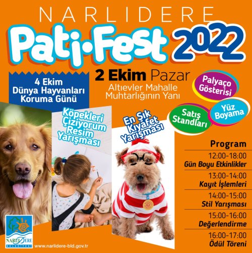Narlıdere Belediyesi tarafından düzenlenen Pati-Fest 2022 bu sene de renkli görüntülere sahne olacak. Dünya Hayvanları Koruma Günü kapsamında 2 Ekim Pazar Günü Sahilevleri Altıevler Mahallesi Muhtarlığı yanında gerçekleştirilecek festival, hayvan dostlarını bir araya getirecek.