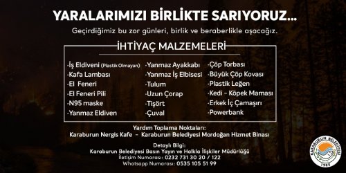 Medya Ege- Karaburun Belediye Başkanı Av. İlkay Girgin Erdoğan, sosyal medya üzerinden paylaştığı gönderide, Türkiye'nin dört bir yanında başlayan orman yangınlarında vatandaşların ihtiyaç duyabileceği malzemelerin tedarik edilmesi ve taşınması için vatandaşlara davette bulundu.
